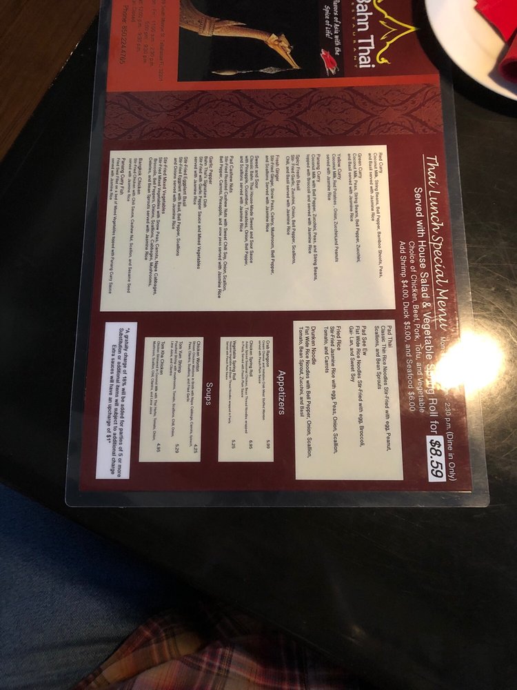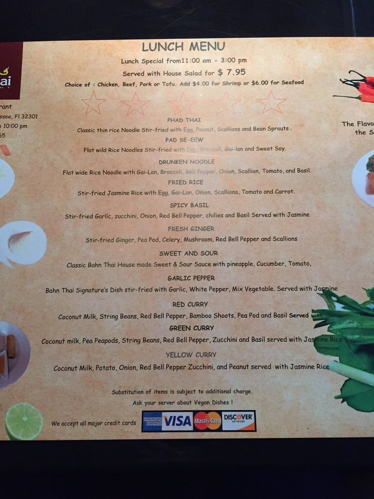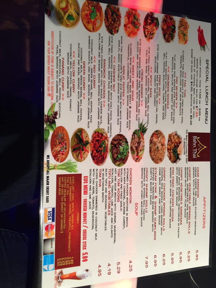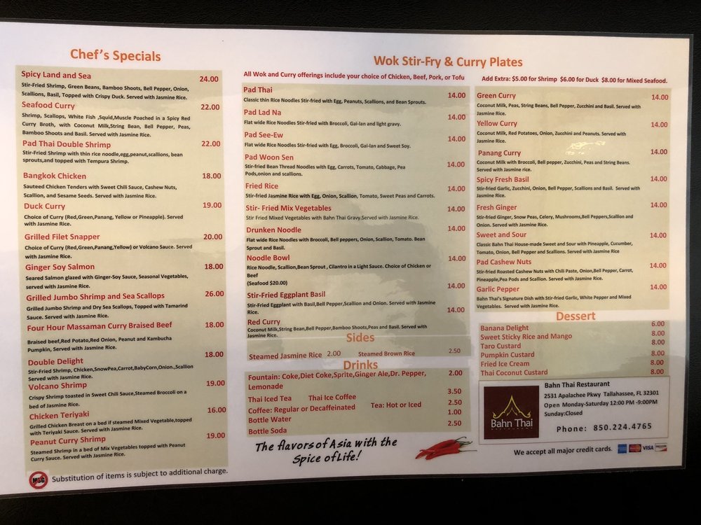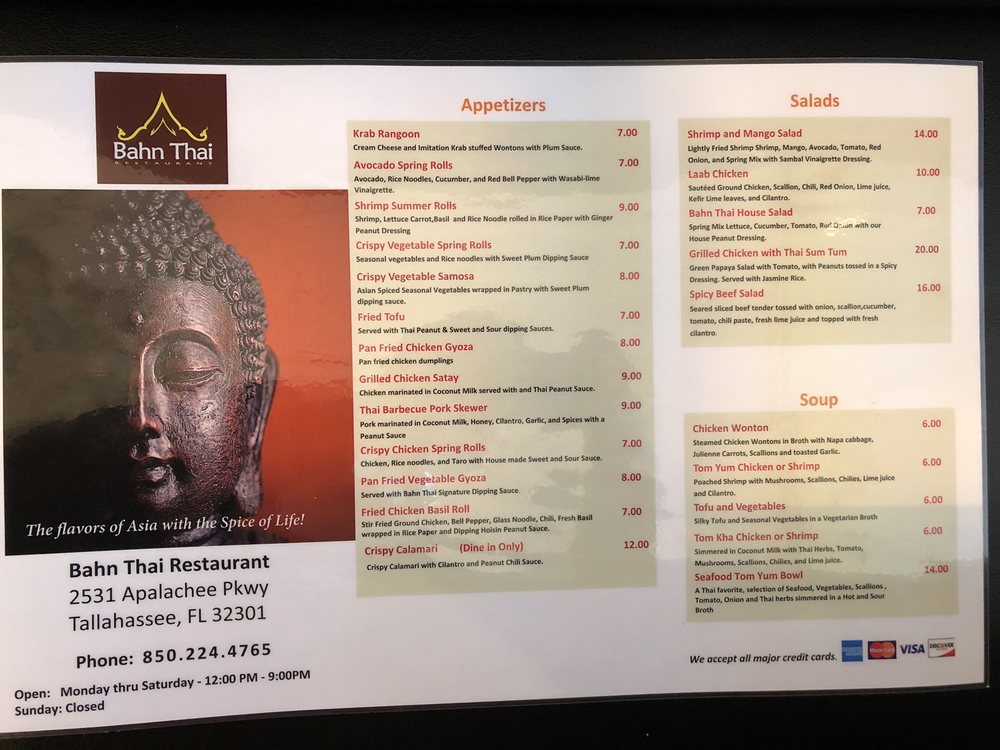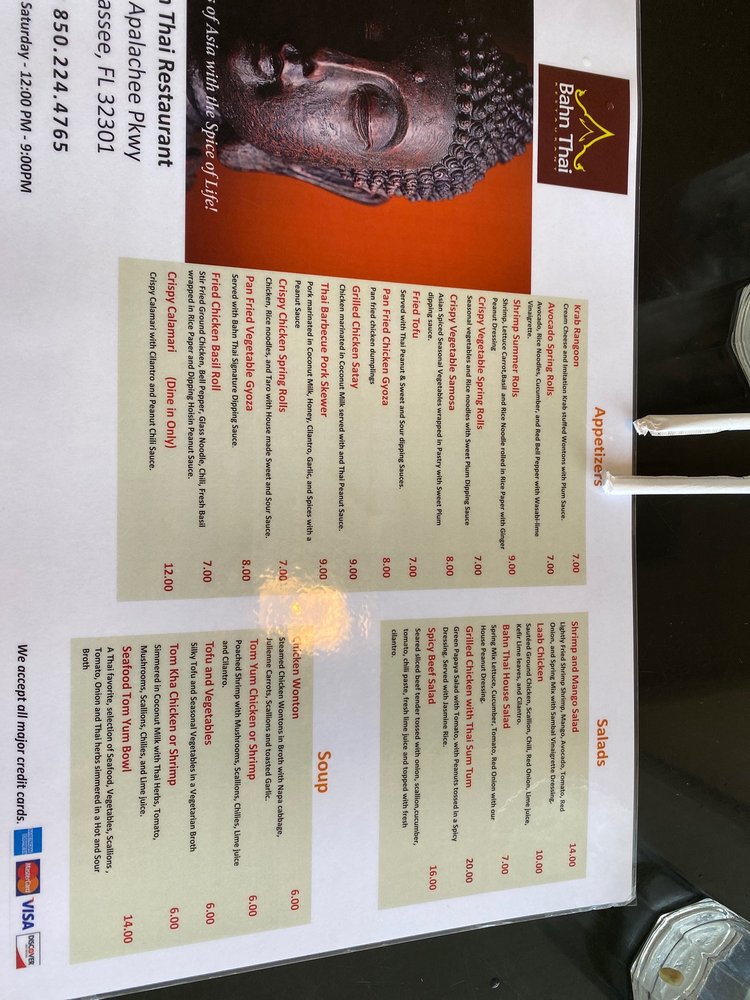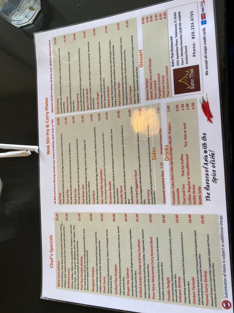 Introducing the menu at Bahn Thai Restaurant, located in Tallahassee, FL, offers a wide range of authentic Thai cuisine. The restaurant provides vegan and vegetarian options, accepts credit cards and Apple Pay, and features a full bar with happy hour specials. Customers rave about the delicious dishes, with highlights including Tom Kah soup, yellow curry with chicken, Chicken Pad Thai, and Pork Penang Curry. The homemade noodles are a standout feature, and the staff is praised for their friendly service. While the restaurant may experience occasional staffing issues, the food quality and hospitality are consistently top-notch. Bahn Thai Restaurant is a must-visit for anyone craving flavorful and authentic Thai cuisine in the area.